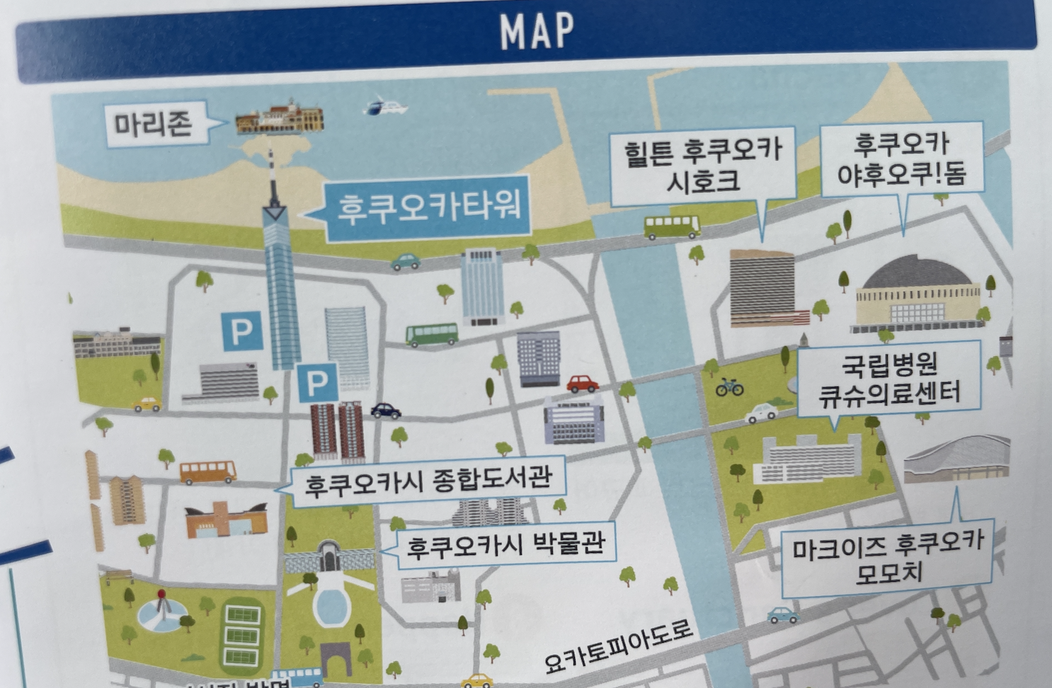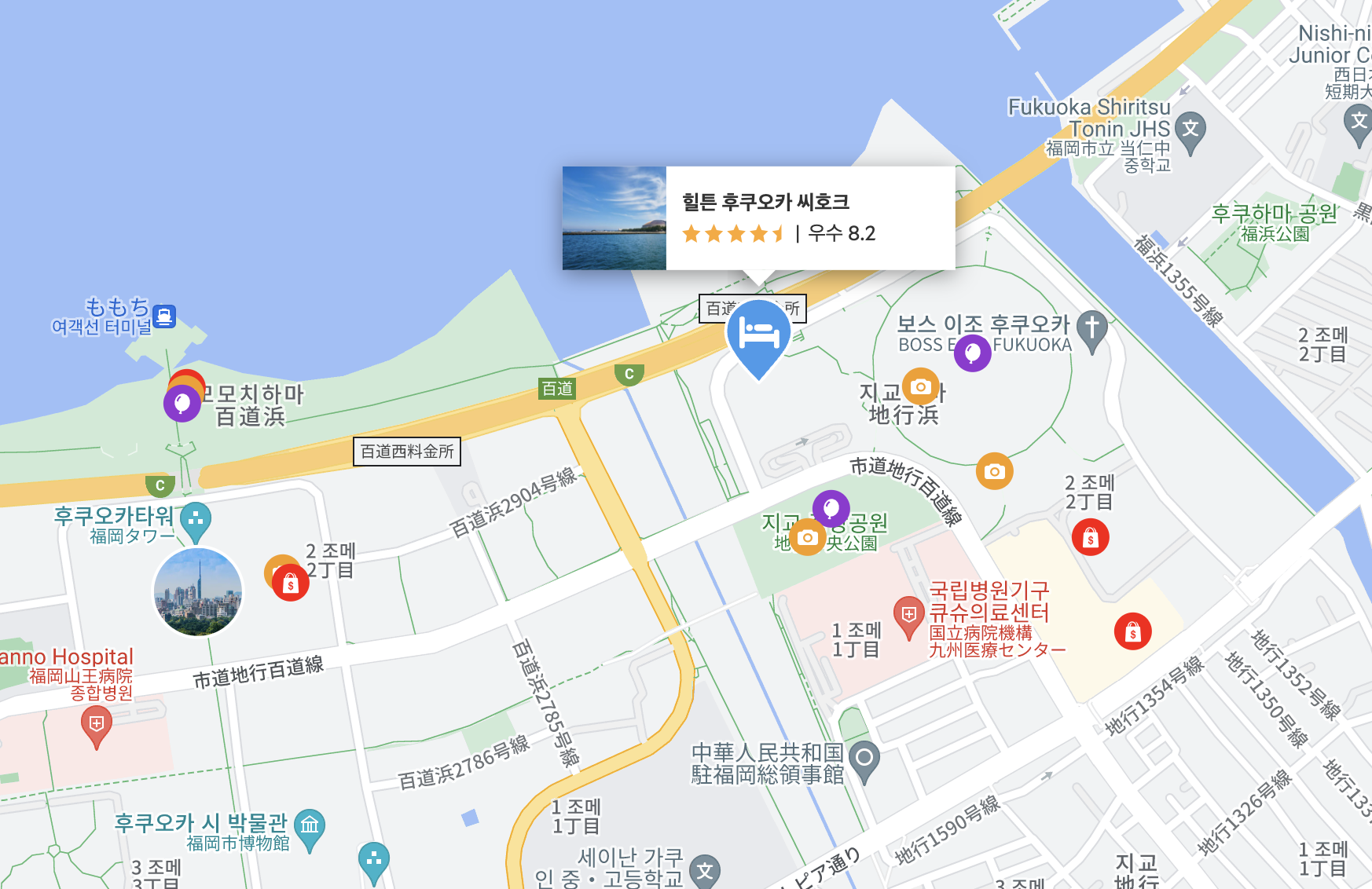 힐튼 호텔을 중심으로 왼쪽으론 '모모치해변'과 '후쿠오카타워'가, 오른쪽으론 '후쿠오카 돔'과 '마크지으 후쿠오카 모모치'가 있습니다!
